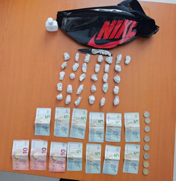 “Tridhjetë e një (31) qese të vogla të mbështjellura me folijë alumini ku dyshohet të jenë me substancë narkotike Marihuanë, me sasi 34.8 gram. Tetëdhjetë e tetë (88) €uro para të gatshme; Një (1) telefon Iphon X; Një (1) brisk prej 15 cm, me teh prej 6 cm (ngjyrë e zezë dhe metalike); Një (1) pako cigare; Një (1) parfum”, njofton policia.