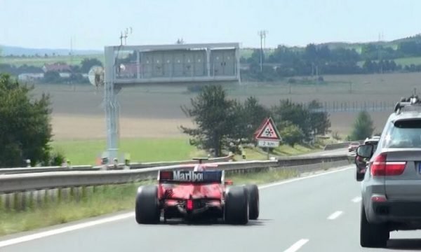 Nuk ndodh shpesh që të shohësh në autostradë një makinë Ferrari të dizajnuar për të garuar në Formula 1, por drejtuesit e mjeteve në një rrugë në Republikën Çeke janë përballur me një skenë të tillë.