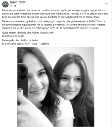 Ne një postim të SHMK “Drita” – Kërçovë njoftohet për humbjen tragjike të dy nxënëseve të kësaj shkolle, Eriona Ramadani dhe Albina Abazi.