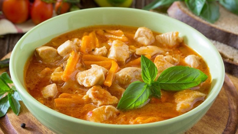 Qepen e grirë fërgojeni në vaj të nxehur dhe shtoni karotat e prera në rrathë. Pastaj përzieni dy lugë piper të kuq dhe copëzat e mishit të pulës dhe fërgoni.