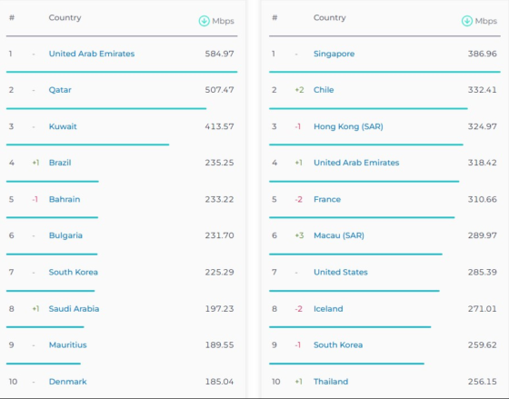 Sipas raportit, Emiratet e Bashkuara Arabe udhëheqin listën për internetin mobil me 584.97 Mbps, ndjekur nga Katari me 507.47 Mbps dhe Kuvajti me 413.57 Mbps.