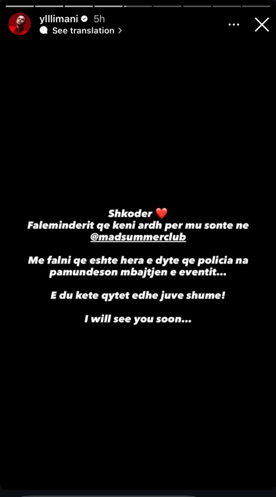 “Shkodër ❤️ Faleminderit që keni ardh për mu sonte… Më falni që është hera e dytë që policia na pamundëson mbajtjen e eventit. E du këtë qytet edhe juve shumë! I will see you soon,” – shkroi Limani në Instagram.