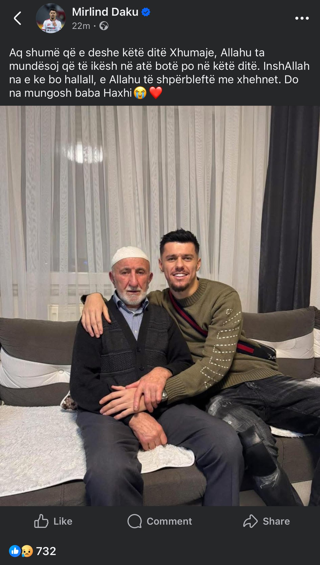 “Aq shumë që e deshe këtë ditë Xhuma, Allahu ta mundësoj që të ikësh në atë botë po në këtë ditë. InshAllah na e ke bo hallall, e Allahu të shpërbleftë me xhennet. Do na mungosh baba Haxhi.”