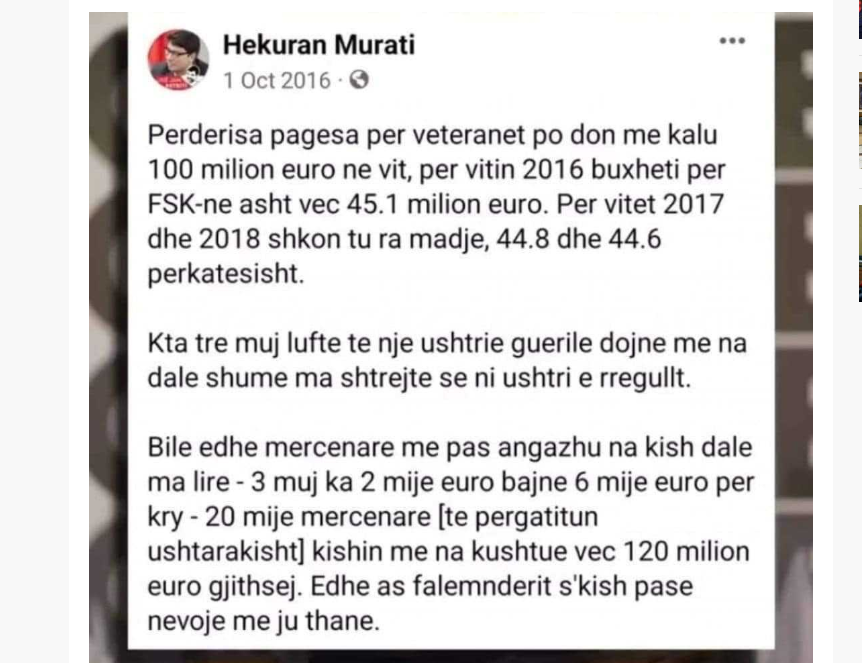 “Përderisa pagesa për veteranët po don me kalu 100 milionë euro në vit, për vitin 2016 buxheti për FSK-në asht vec 45.1 milionë euro. Për vitet 2017 dhe 2018 shkon tu ra madje, 44.8 dhe 44.6 përkatësisht. Këta tre muj lufte të një ushtrie guerile dojnë me na dalë shumë ma shtrejtë se ni ushtri e rregullt.”, kishte shkruar Murati.