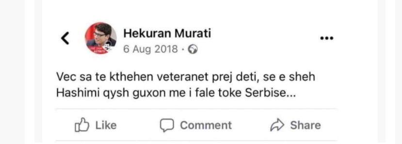 “Veç sa të kthehen veteranët prej deti, se e sheh Hashimi qysh guxon me i falë tokë Serbisë…” , kishte shkruar ai më 6 gush të vitit 2018.