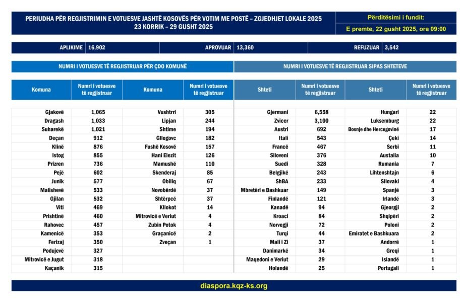 - përmes postës duke dërguar aplikimin në kutinë postare të KQZ-së në KosovëNga data 23 korrik dhe deri të premten, më 22 gusht 2025, përmes platformës elektronike https://diaspora.kqz-ks.org janë pranuar 16,902 aplikime për regjistrim për votim me postë, prej të cilave janë aprovuar 13,360, ndërkaq janë refuzuar 3,542.